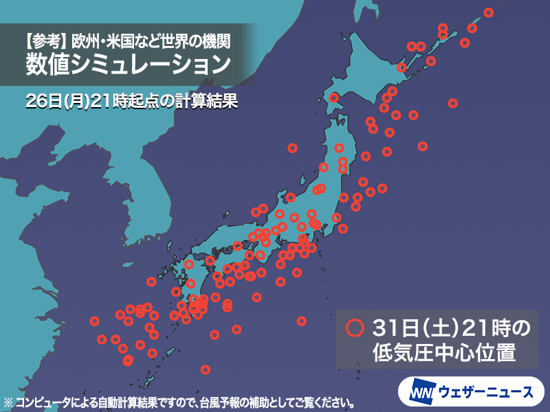 世界各地の気象機関による複数の数値シミュレーション結果をもとに31日(土)21時の低気圧中心位置を地図上にプロットすると、北東—南西方向に非常に大きなばらつきがあり、進行速度の予測誤差がかなり大きくなっていることを示しています。現在の台風情報よりもさらに遅くなることも考えられるため、今後の予報の変化にも注意してください。