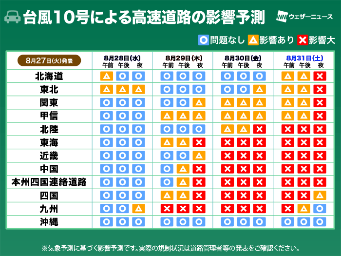台風10号の接近・上陸に伴い、九州では28日(水)夜から影響が出始めることが予想されます。また、北日本では28日(水)にかけて前線の影響で、雨による速度規制の可能性があります。