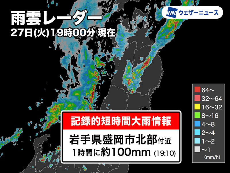 岩手県で1時間に約100mmの猛烈な雨 記録的短時間大雨情報