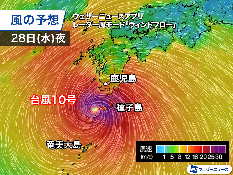 九州では明日から徐々に台風本体による影響が大きくなり、進路に近い地域では瞬間的に40〜50m/sの猛烈な暴風が吹き荒れるおそれがあります。30日(金)以降は中国・四国、近畿なども暴風となる予想です。台風の速度が上がらず、影響が長引くおそれがあります。