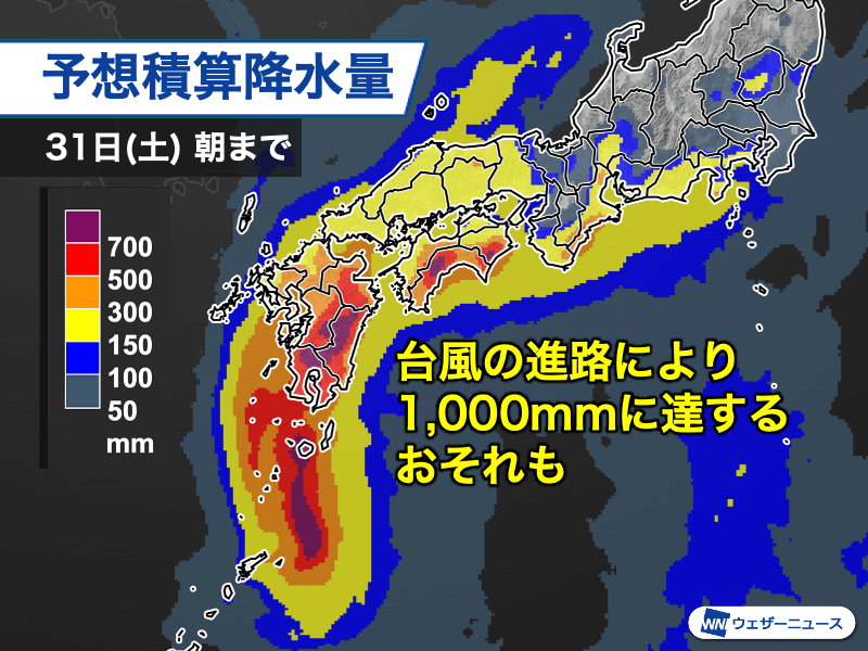 台風の動きがより遅くなった場合は強い雨が長引いて、総雨量が1000mmに達するおそれがあります。九州では局地的に100年に一度あるかないかの記録的な大雨となることが考えられる状況です。避難などを行う場合は早めに判断するようにしてください。
