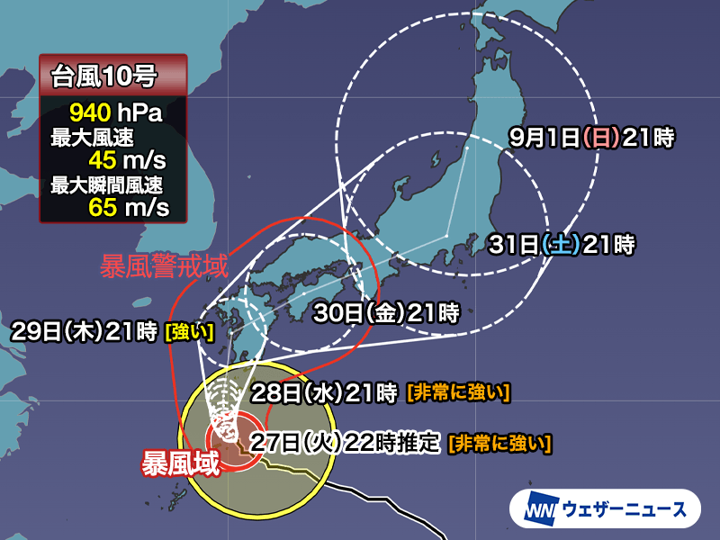 8月27日(火)22時の推定で、非常に強い勢力の台風10号(サンサン)は、発達を続けながら鹿児島県奄美市の東北東でほとんど停滞しているとみられます。明日28日(水)は奄美地方に加え、種子島・屋久島や九州本土でも次第に風雨が強まる見通しで、厳重な警戒が必要です。