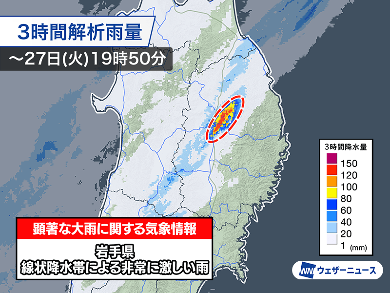 岩手県内陸付近では非常に激しい雨が降り続き、3時間に150mmを超える雨が降ったとみられ、土砂災害や河川の氾濫が発生するおそれが急激に高まっています。