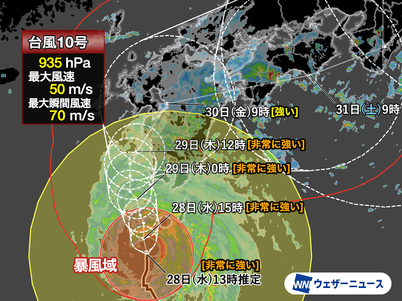 九州では徐々に台風本体による影響が大きくなり、進路に近い地域では瞬間的に40〜50m/sの猛烈な暴風が吹き荒れるおそれがあります。
