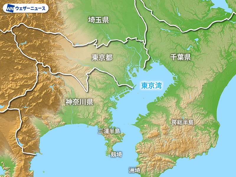 東京湾は、房総半島西側の洲埼(すのさき・千葉県館山市)と三浦半島の剱埼(つるぎざき・神奈川県三浦市)を結ぶ線より北の水域で、湾奥に東京があります。