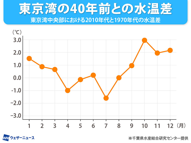 「2010年代と、40年前の1970年代の月別水温を比較すると、9月から翌年3月までの秋冬季の水温が高く、特に10~12月は2~3℃上昇しています。