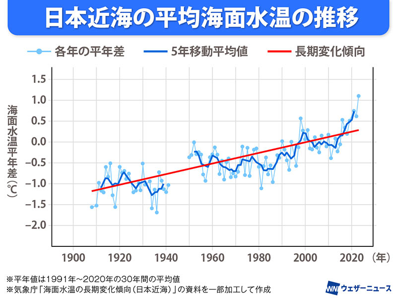 温暖化の影響は東京湾だけではありません。日本近海の海水温は、2023年までの100年間において1.28℃上昇しました(年平均海面水温)。世界平均の上昇率(+0.61℃/100年)よりも大きく、日本の気温の上昇率(+1.35℃/100年)に匹敵する値です。