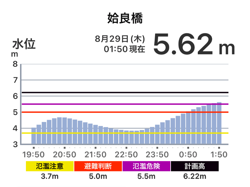 川の様子を見に行くのは危険ですので厳禁です。浸水しにくい上の階に移動するなど、身の安全を確保して過ごすようにしてください。