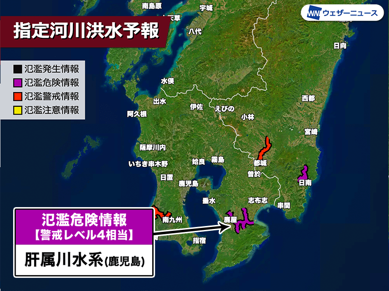 台風による大雨の影響で鹿児島県を流れる肝属川水系が増水し、1時50分に氾濫危険情報(警戒レベル4相当)が発表されました。