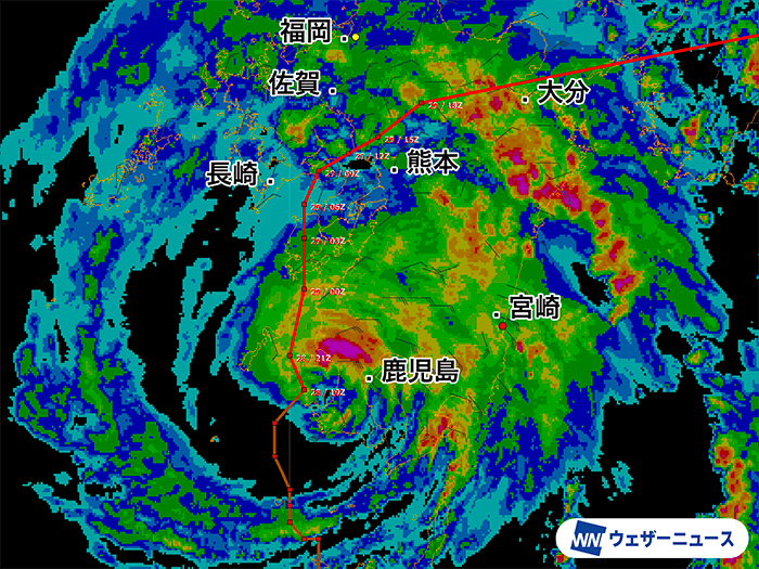 台風の中心付近やスパイラルバンドと呼ばれる腕状の雨雲の直下では非常に激しい雨が降っていて、大雨となっています。鹿児島県内では24時間降水量が500mmを超えている所もあります。台風が上陸したあとも雨のピークは続き、進行速度が遅いため影響が長引く見込みです。