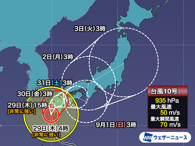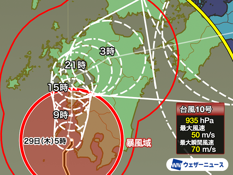 台風10号は今夜以降、進路を東寄りに変えて西日本を縦断するように進む予想です。陸上を移動する影響で次第に勢力を落とし、明日30日(金)のうちには暴風域がなくなる見通しです。