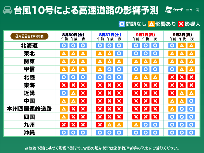 台風の速度が遅いため、週明けにかけて西日本や東海の高速道路では影響が長引く可能性があります。また、進路次第で関東以北の高速道路でも雨や風が強まり、影響が出る可能性があります。