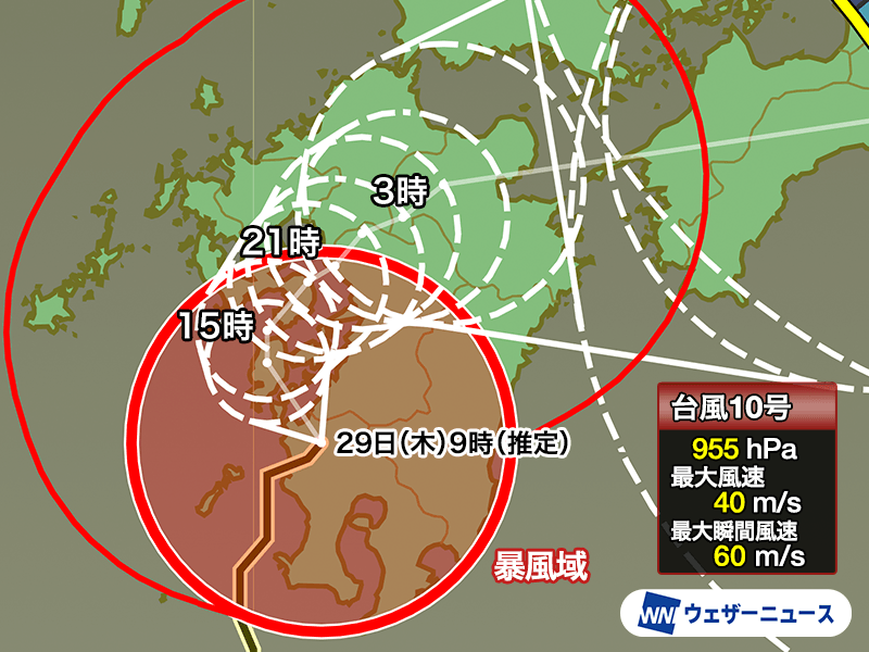 台風10号は今夜以降、進路を東寄りに変えて西日本を縦断するように進む予想です。陸上を移動する影響で次第に勢力を落とし、明日30日(金)のうちには暴風域がなくなる見通しです。