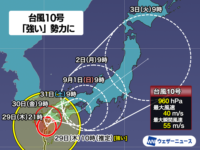台風10号はこのあとも九州西岸付近を北上し、夕方〜夜に長崎県付近、夜遅くには熊本県付近に達する予想です。風の影響は特に明日30日(金)までが顕著で、海上では瞬間的に60m/sを超える暴風が、陸上でも50m/s前後の暴風が吹くおそれがあります。家屋に損壊がでるおそれがあるレベルですので、暴風の吹き荒れる間は安全な屋内で過ごしてください。各地で暴風によるとみられる停電も発生しています。