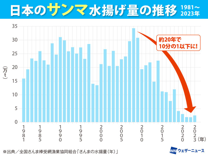 日本のサンマの水揚げ量は、20万~30万tほどで推移していましたが、近年は減少傾向で、2022年は1.8万tと過去最低を記録しました。約20年で10分の1以下になっているのです。