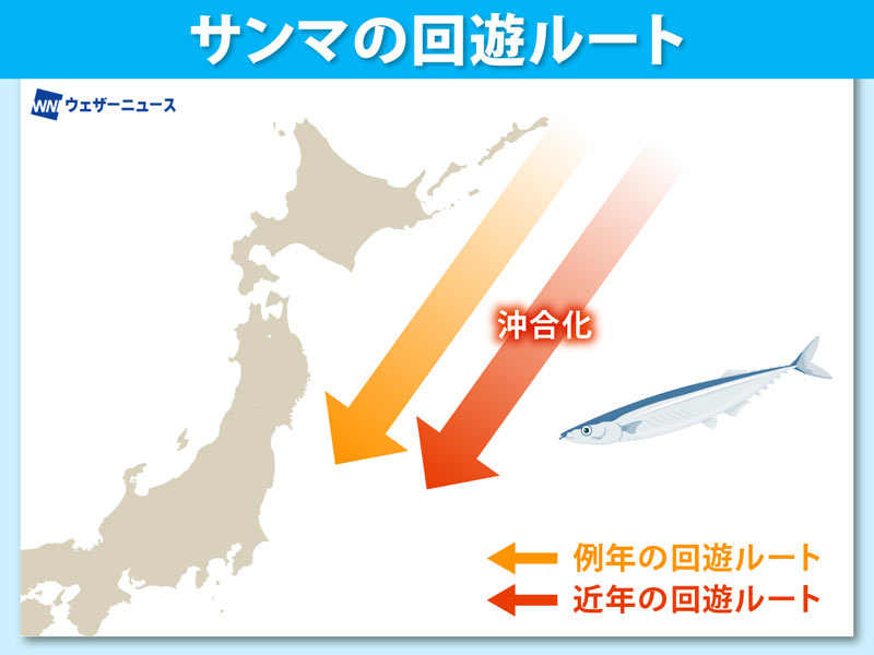 「それにも回遊の沖合化や水温の上昇が関連していると考えられます。サンマは南から北へ泳いで行った後に日本の近くに戻ってくるのですが、日本の近くは親潮と黒潮(日本海流=暖流)が混じりあうため、餌環境が良く、そこを回遊すると大きく育ちます。