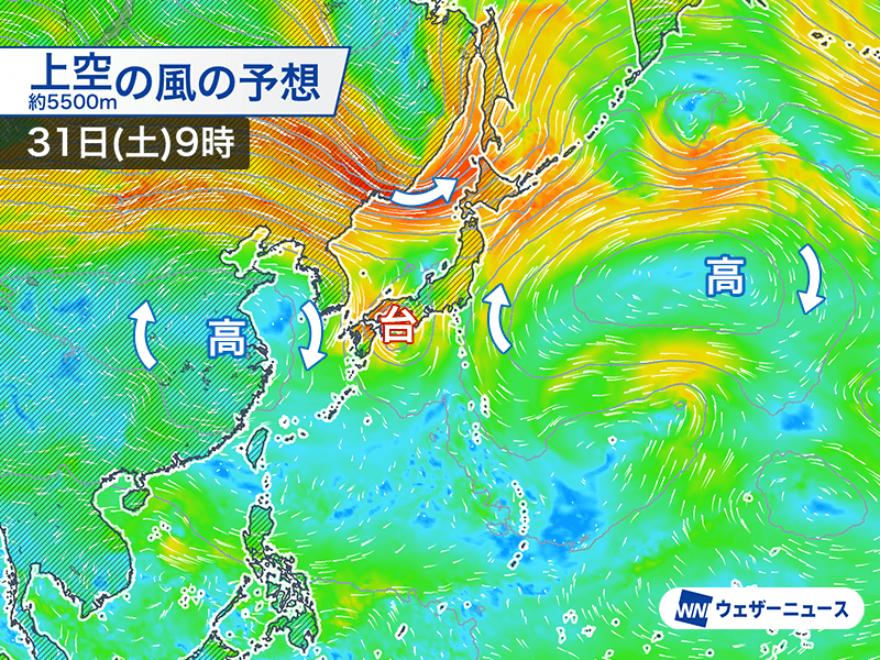 台風を流す上空の風が弱く、四国から近畿付近で複雑な動きをする可能性があります。週末にはほとんど停滞することも考えられ、影響が長引くおそれもあります。