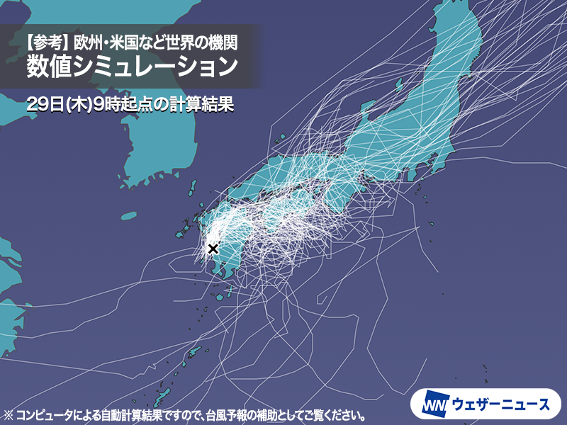 これらを比較すると、四国付近で動きが複雑になり、北東に進む予想をしているグループと、南西に進む予想をしているグループがあるのがわかります。先ほど解説したどちらの風に流されるかで分かれているといえます。現時点では北東進する予想をしているグループが多数派です。