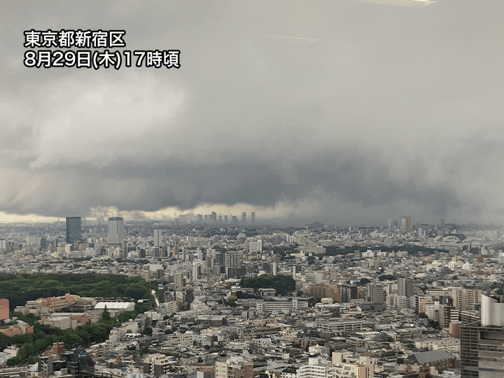 東京都内など関東南部では台風10号と高気圧の間を吹く南寄りの風によって湿った空気が次々に流れ込み、雨雲の発達しやすい状況です。夕方になり雨雲が急速に発達して、アーチ雲の現れた所がありました。