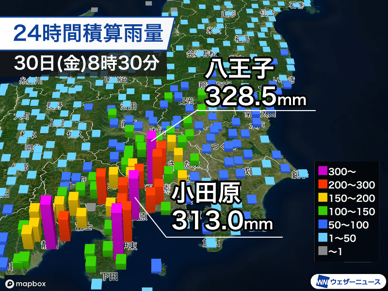 8時30分までの24時間では八王子市で328.5mm、神奈川県小田原市で313.0mm、相模原市・相模原中央で292.0mmなど、1年の中で最も雨が多い9月1か月の平年雨量を大幅に上回る大雨です。