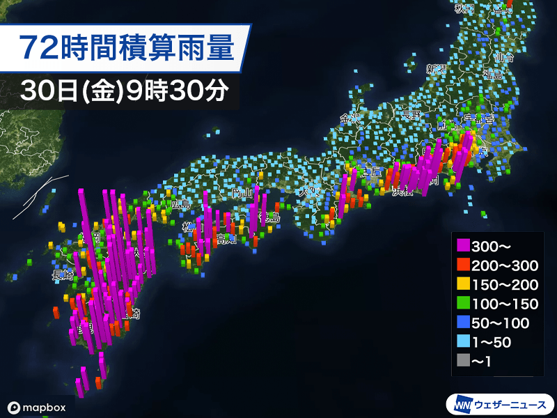 今回は台風の接近前から雨の強まった所があり、総雨量が多くなっています。27日(火)から30日(金)9時までの雨量は、宮崎県えびの市・えびの高原で897.5mm、美郷町・神門で819.0mmに達しました。また、大分県由布市・湯布院は620.5mm、静岡市は555.0mmと、8月1か月の平年雨量の2〜3倍の大雨です。