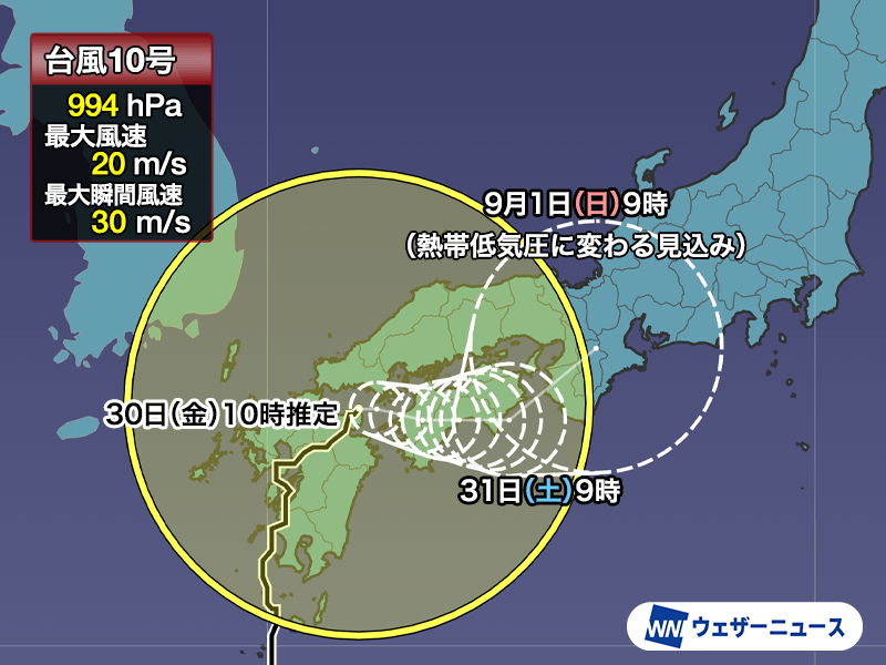 台風は今日30日(金)に九州を離れ、四国付近を東進する予想です。明後日9月1日(日)には熱帯低気圧に変わる見込みです。