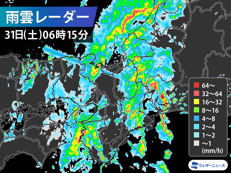台風の東側の活発な雨雲が紀伊半島にかかっていて、台風に吹き込む南東からの風が紀伊山地にぶつかることで雨雲は一層発達するとみられます。局地的に1時間に50mm以上の非常に激しい雨の降るおそれがあるため警戒が必要です。