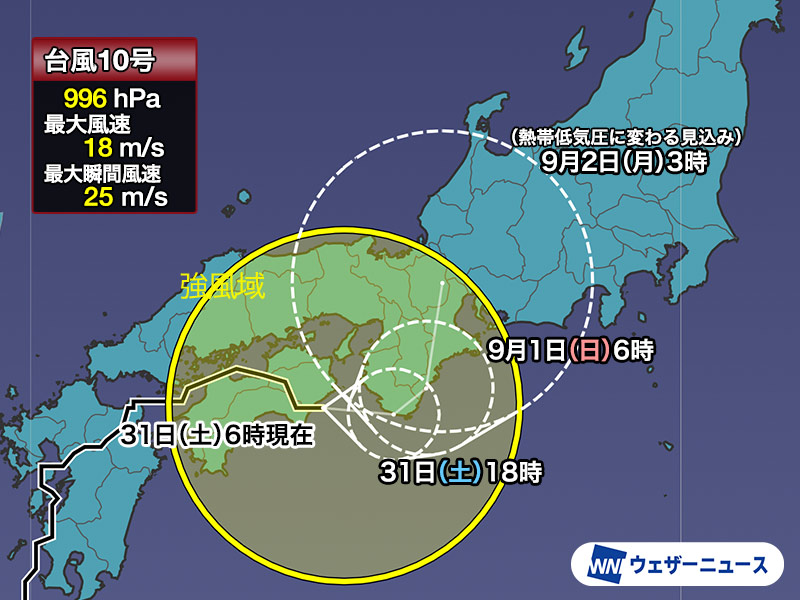 台風10号は四国を抜けて、ゆっくりとした速度で紀伊半島付近へ進むと見られます。また、明後日2日(月)にかけての進路はまだ不確実性が高い状況ではあるものの、台風から熱帯低気圧へと変わりながら東海エリア付近でほとんど停滞する可能性があります。そのため、近畿や東海を中心に雨量が多くなる見込みです。