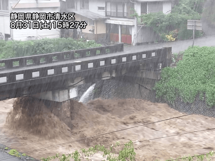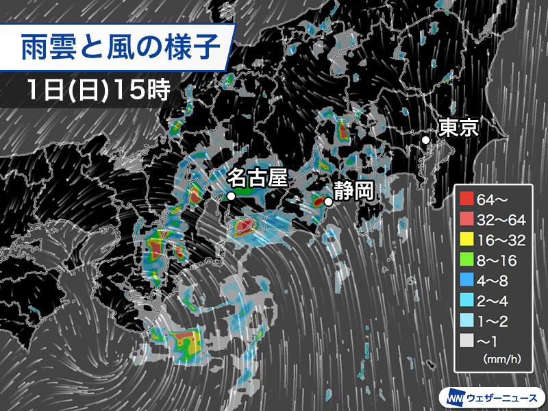 雨の中心は愛知県や静岡県に移ってきており、15時30分までの1時間には愛知県新城市で58.0mm、静岡県富士市で50.5mmの非常に激しい雨を観測。雨雲の一部は山梨県まで拡大し、南部町で44.0mmを観測しました。