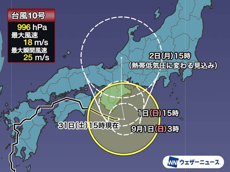 台風は紀伊半島沖で速度を落とした後、日本の東から張り出す高気圧の縁を進む形で北へ進む予想となっています。このため、東海では明日9月1日(日)も雨が強まりやすく、雨量がさらに増加する予想です。明後日2日(月)にかけての48時間で多い所では200mm以上の雨が降る見込みです。