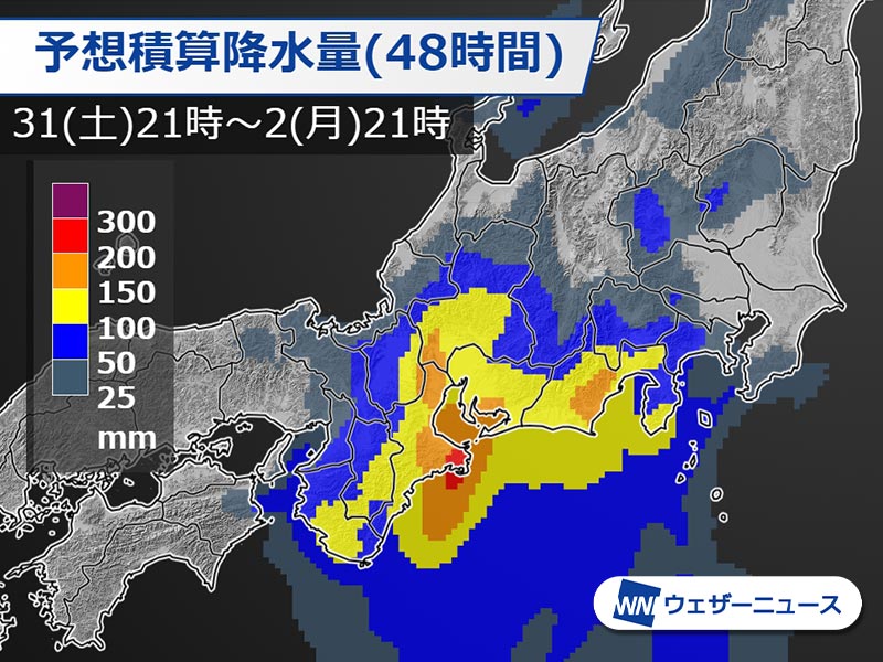 台風は東海道沖で速度を落として停滞した後、日本の東から張り出す高気圧の縁を進む形で北へ進む予想となっています。このため、東海では今日1日(日)も雨が強まりやすく、雨量がさらに増加する予想です。明日2日(月)にかけての48時間で多い所では200mm以上の雨が降る見込みです。