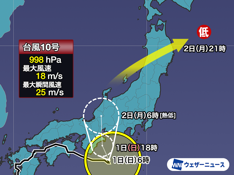 台風10号は今夜には風速が低下し熱帯低気圧に変わり、その後日本海で温帯低気圧に変わる予想です。前線と一体化して、明日2日(月)に北日本を通過する見込みです。
