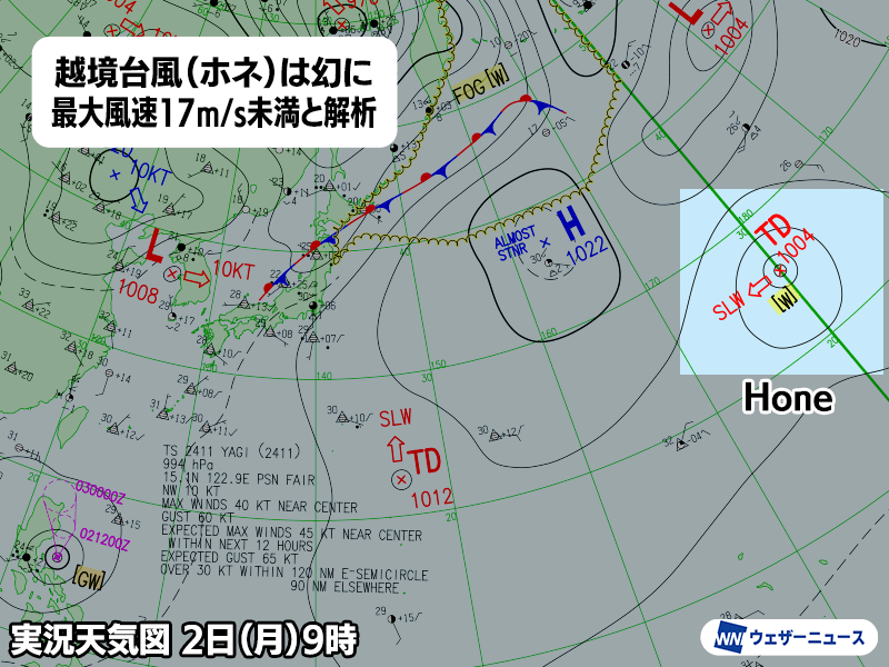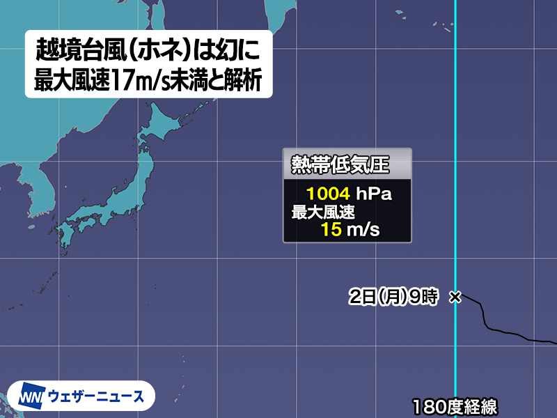 越境台風(ホネ)は幻に 域外から入るも、風速が台風の基準値未満と解析