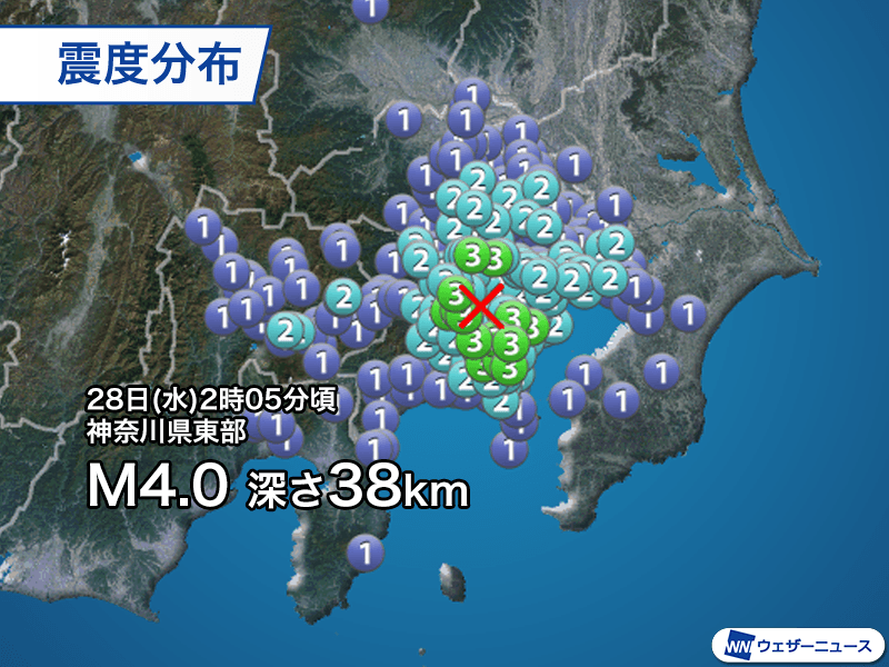 28日(水)2時05分頃、神奈川県東部を震源とするマグニチュード4.0、深さ38kmと推定される地震が発生しました。この地震で神奈川県横浜市、川崎市、相模原市、東京都八王子市、町田市などで最大震度3、関東南部を中心とする広い範囲で震度1〜2の揺れを観測しました。