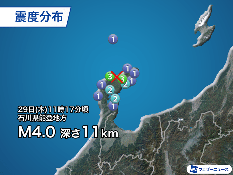 国内:能登半島の地震活動で約2か月ぶりの震度3