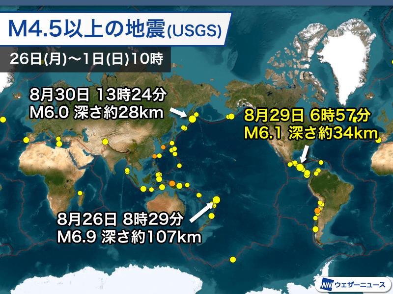 アメリカ地質調査所の解析によるマグニチュード6以上の地震は4回発生しました。最も大きな地震は南太平洋トンガ近海で発生したマグニチュード6.9です。