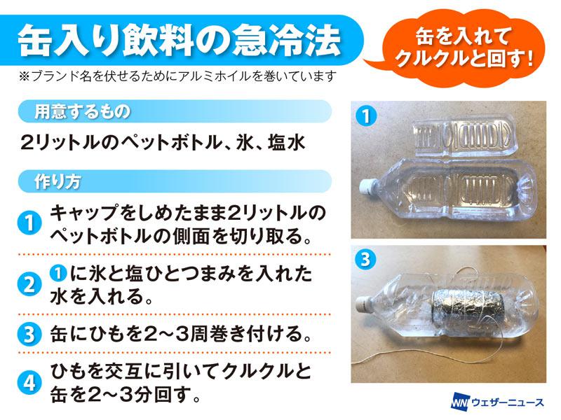 「まず、キャップをしめたまま、四角い2リットルのペットボトルの側面を切り取ります。そこに氷と塩をひとつまみいれた水を注ぎます。これで即席の急冷器の完成です。あとは缶を入れてクルクルと回せば、2~3分で缶の中身はキンキンに冷えます。タコ糸のようなひもがあれば、缶に巻き付けて交互に引くと、効率よく缶を回すことができます」(飯岡さん)