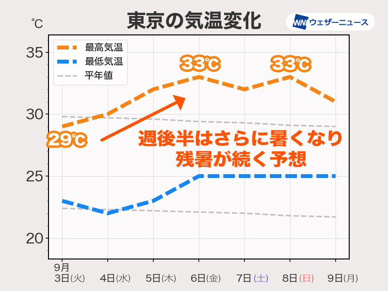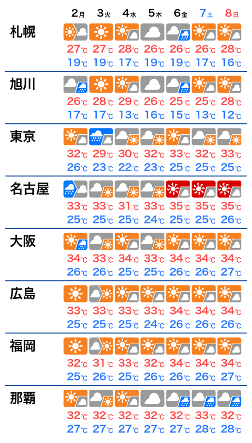 週の後半は上空の高気圧が勢力を強め、夏の空気が西日本や東日本を覆うようになる見込みです。東海や西日本は最高気温が35℃くらいまで上がり、真夏のような厳しい暑さになります。関東も最高気温が33℃前後で、朝の気温も高く厳しい残暑が続く予想です。この先しばらくも、熱中症対策や夏バテ対策が欠かせません。