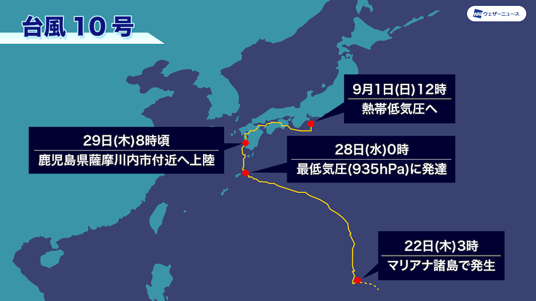 28日(水)は勢力を保ったまま屋久島の西を通過し、29日(木)8時頃に鹿児島県薩摩川内市付近に上陸。その後、ゆっくりと九州を縦断しながら瀬戸内海に抜け、四国を通過し太平洋へと進んだあと9月1日(日)12時に熱帯低気圧へと変わりました。