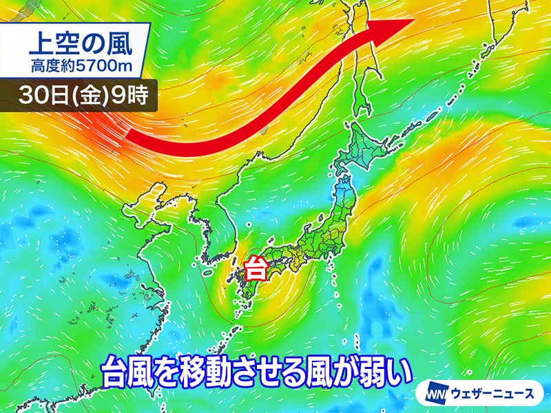 日本付近に近づいた後も長く滞在したのは、台風を移動させる上空の風「指向流」が弱いことが理由の一つとして挙げられます。日本付近に近づいた台風は強い偏西風に乗って西から東へ通過することが多いですが、今回は偏西風が北海道付近に離れていたために影響を受けることができず、ゆっくりとした速さで進んだことで長時間日本付近に影響をもたらしたと言えます。