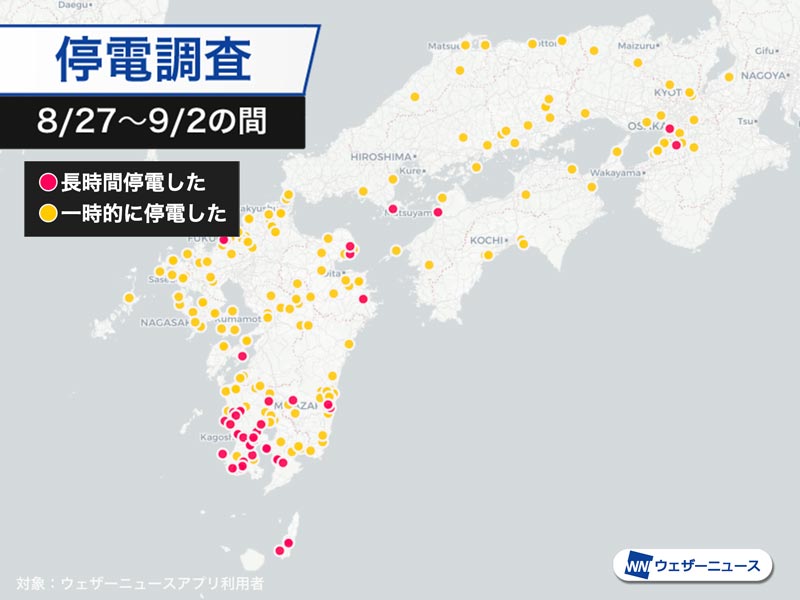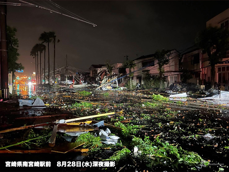 さらに、宮崎市では竜巻が発生し、ウェザーリポートにも被害の様子が複数寄せられました。ウェザーニュースアプリを通じた調査でも突風による被害があったエリアが宮崎市周辺であることがわかりました。雨雲レーダーを見ると、宮崎市付近にはスパイラルバンドと呼ばれる台風を取り巻く腕状の雲列がかかっており、竜巻やダウンバーストなどの突風を発生させた可能性が高いと考えられます。