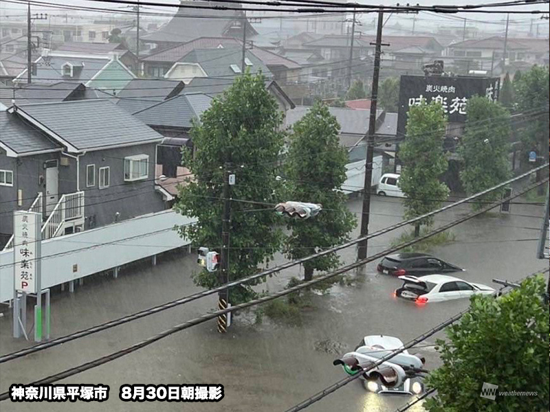 8月30日(金)朝には河川が氾濫したとして、埼玉県川越市や神奈川県二宮町で緊急安全確保が発令されました。神奈川県小田原のアメダスでは9月1日(日)7時30分までの72時間に529.5mmの雨を観測し、神奈川平塚や小田原など関東南部で大規模な冠水被害が発生しています。ウェザーニューズ気候テックチームよると、小田原の雨量は300年に一度あるかないかの水準であると解析されています。