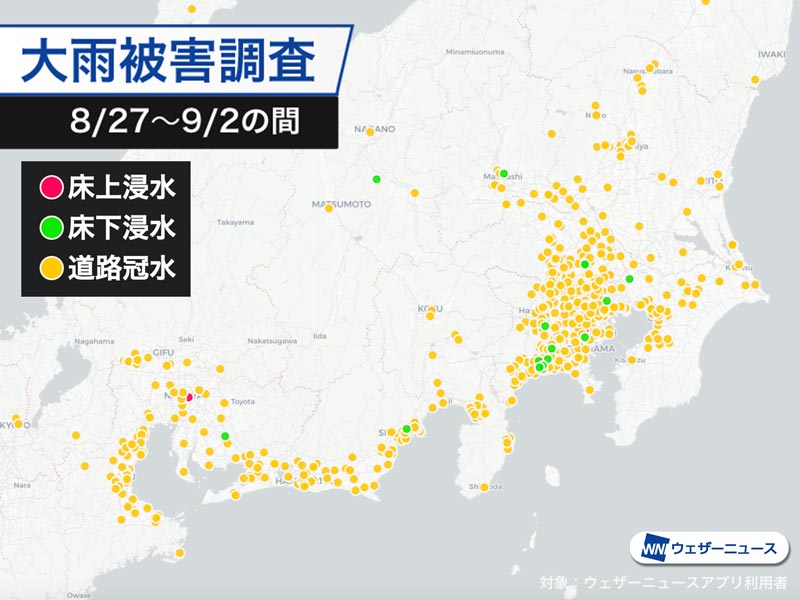 ウェザーニュースアプリを通じた調査でも、台風から離れていた関東や東海で道路冠水、一部で床下浸水や床上浸水が発生したとの報告がありました。