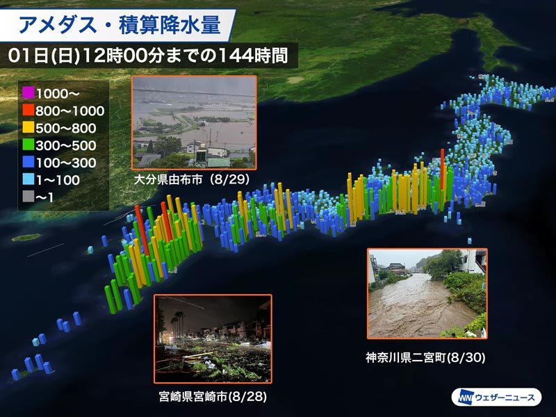 28日(水)から29日(木)にかけては、台風上陸前から鹿児島県、宮崎県では記録的短時間大雨情報が発表され、台風の壁雲やスパイラルバンドなどの雨雲について、気象庁は線状降水帯だとして顕著な大雨に関する気象情報を発表しました。大分県湯布院のアメダスでは8月30日23時20分までの72時間に642.0mmの記録的大雨を観測し、8月平年値の約2.7倍がこの期間だけで降ったことになります。