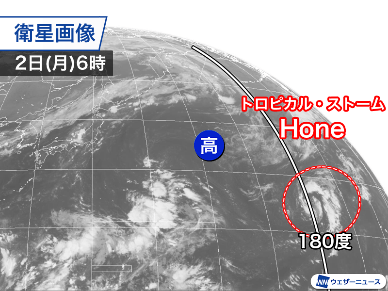 Hone(ホネ)はハリケーンから一旦は勢力を弱めて熱帯低気圧となりましたが、2日(月)6時の時点では中心付近の最大風速が18m/sと解析され、トロピカル・ストームとなっています。