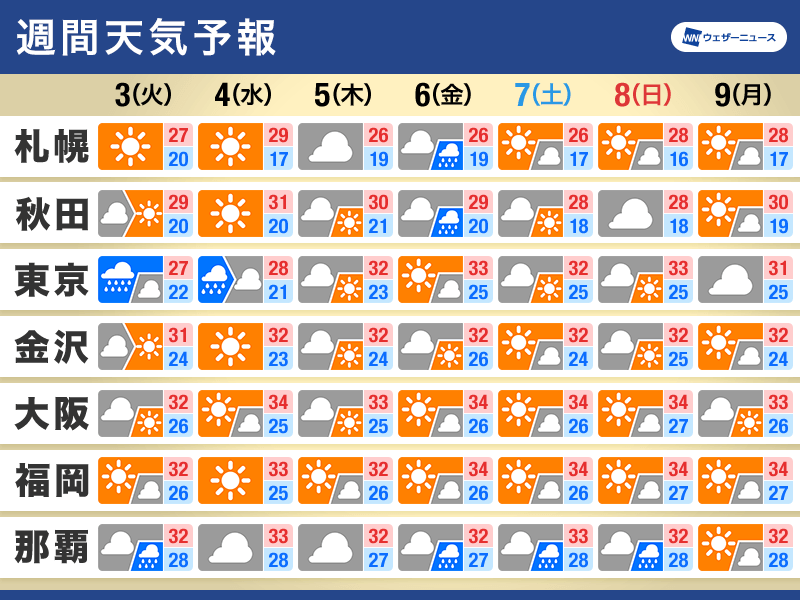 明日3日(火)以降は西から高気圧に覆われて晴れるところも多くなる予想です。西日本や東日本では最高気温が35℃前後の厳しい残暑となる日も予想され、猛暑日になるところもあります。真夏ほどの顕著な暑さではないものの、熱中症予防は引き続き行ってください。