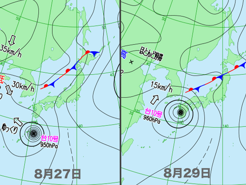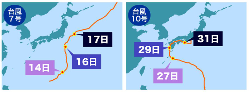 16日と29日は二つの台風が発達のピークを迎えた日で、16日は台風7号が関東地方に最接近、29日は台風10号が鹿児島県に上陸したタイミングと重なります。