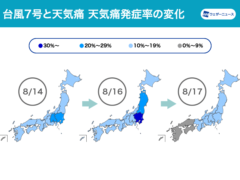 今夏の二つの台風は、台風が近づいて気圧の変動が大きくなるタイミングで、偏頭痛や関節痛、首肩こりといった症状が強まっており、まさに夏台風による天気痛の特徴を持っていると言えます。
