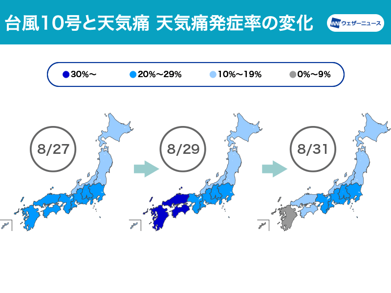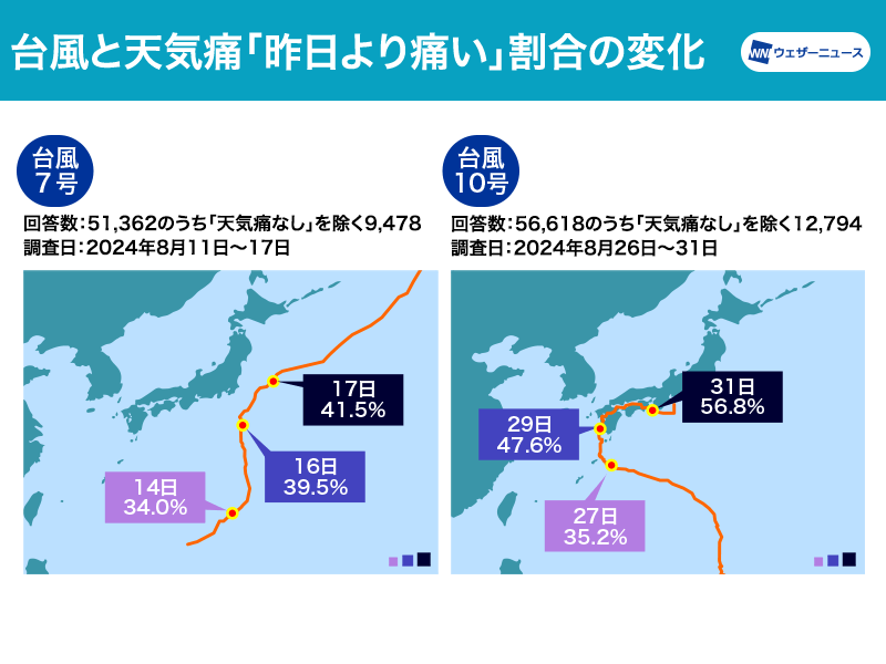 「昨日より痛い」の割合の変化をみると、台風7号、台風10号ともに台風本体が接近するにしたがって天気痛の痛みが増す傾向が見られました。