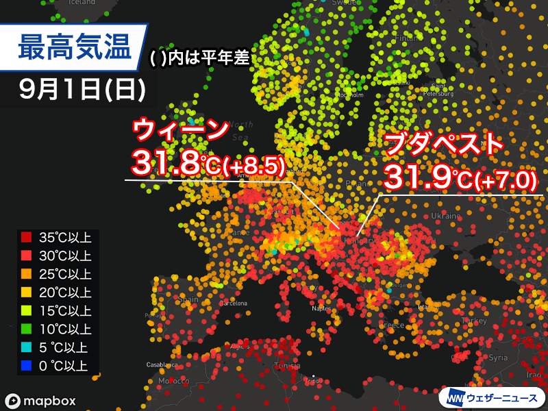 オーストリアの首都ウィーンでは9月1日(日)の最高気温が31.8℃、2日(月)は33.1℃まで上昇し、6日連続で30℃以上を観測しました。平年のこの時期の最高気温は23℃前後で、日本では北海道の旭川市くらいに相当します。また、ハンガリーの首都ブダペストでは1週間以上、暑さが続いている状況です。